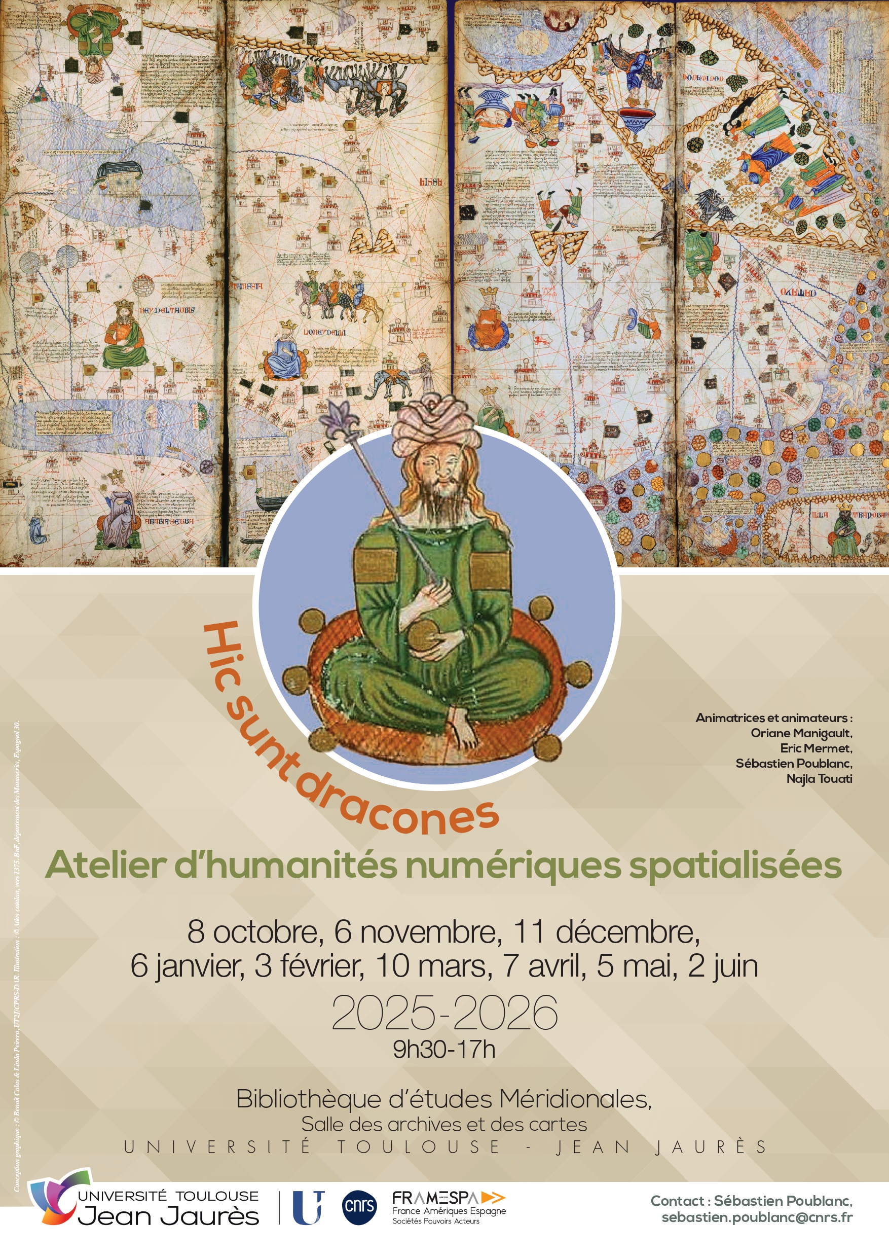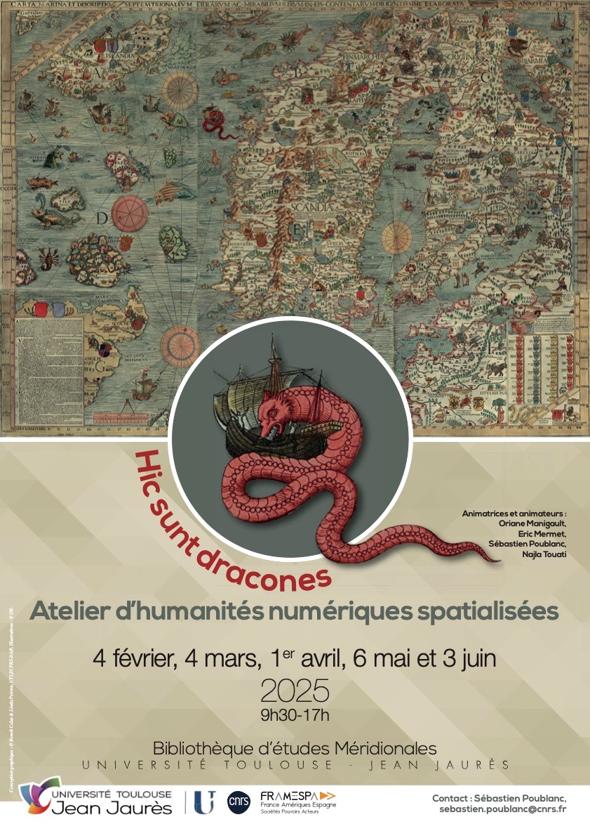 La BEM accueille une fois par mois l'atelier d'humanités numériques spatialisées dans la salle des sources (photos). Animé par une équiped'ingénieur.es issus de FRAMESPA et de projets ANR co-portés par le laboratoire (Oriane Manigault, Eric Mermet, Sébastien Poublanc, Najla Touati), cet atelier prend la forme d'un espace participatif, collaboratif et bienveillant, ouvert à toutes et tous (permant.es et non permanent.es). La matinée est dévolue à la formation sur QGIS tandis que l'après-midi sert à accompagner vos réflexions sur la spatialisation de vos objets et vous proposer des méthodes pour la production d'informations cartographiques. Chacun y est le bienvenue pour venir discuter sur la dimension spatiale de ses recherches.