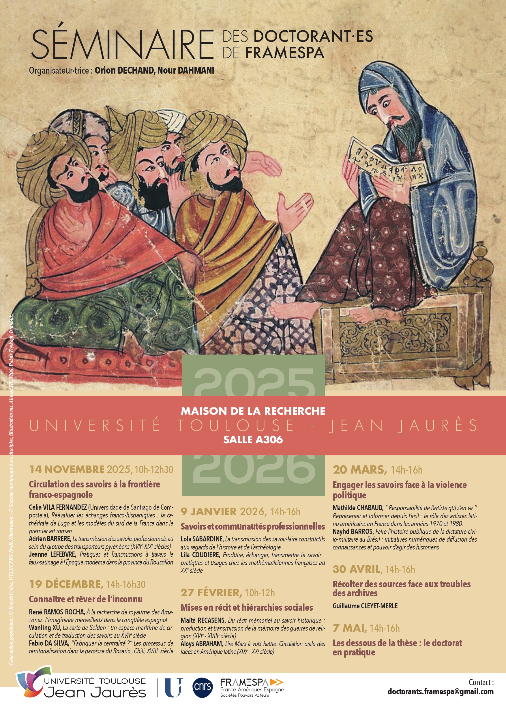 Ouvert aux doctorant·e·s de FRAMESPA et aux masteurant·e·s de l’UT2J, ce séminaire est un espace de discussion marqué par la bienveillance et l’entraide entre doctorant·e·s. L’objectif est de connaître les travaux des un·e·s et des autres et de réfléchir à des questionnements diachroniques et transversaux, tant sur le plan thématique que méthodologique. Le séminaire est également le lieu d’échanges bibliographiques et historiographiques autour de lectures communes.